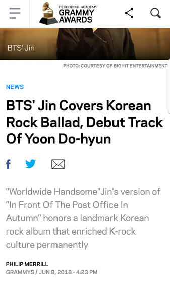 Not only one, but two articles were made by the Grammy Awards website, talking of Seokjin's Autumn Outside the Post Office cover and the release of Epiphany, talking of Kim's 'silver voice'